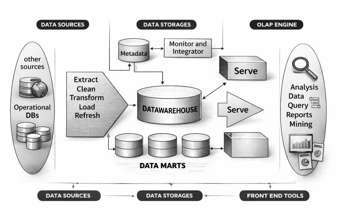 Formal Definition (Bill Inmon – Father of Data Warehousing):A data warehouse is a subject-oriented, integrated, non-volatile, and time-variant collection of data to support management’s decision-making process.